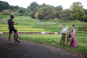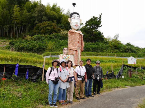 台風の影響で少し雲が多いなか、まずは稲渕の棚田へ。年々高齢化で休耕田が増えるとともに、案山子や彼岸花も減少(彼岸花はイノシシに食べられたのも一因だそうです)。少し寂しい風景ですがみなさんそれぞれにターゲットを決めての撮影です。その後一言主神社まで移動して昼食。