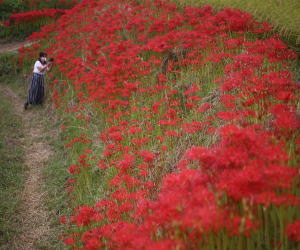 一言主神社付近の田んぼは稲穂の実りに負けないくらい彼岸花が満開。みなさん素晴らしい写真がたくさん撮れたことと思います。最後はコスモスも咲き始めた九品寺での撮影タイムを終え、道の駅かつらぎで甘党タイムを楽しんだ後、帰路へ。赤や白、黄色の彼岸花の撮影に堪能した一日になりました。